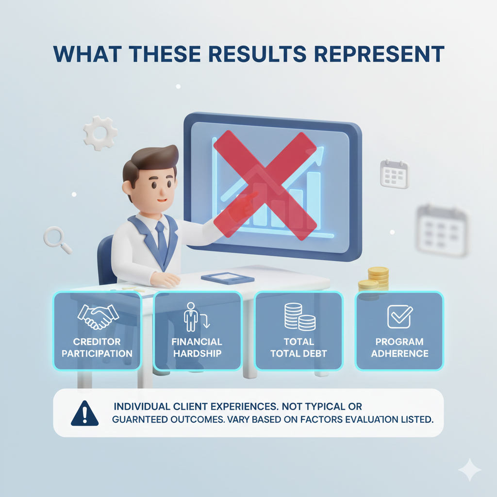 The results shown on this page reflect individual client experiences and are not intended to represent typical or guaranteed outcomes. Settlement amounts, timelines, and savings vary based on factors such as creditor participation, financial hardship, total debt, and program adherence.